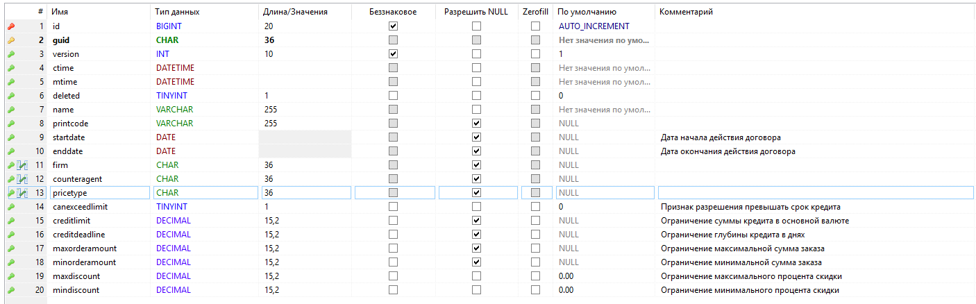 - pricetype - тип цен, по которому оформляются заказы/продажи в рамках этого договора, ссылка на запись таблицы ref_pricetypes