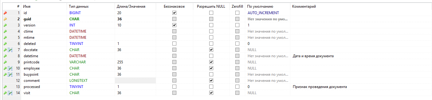 - docstate - состояние документа (проведение и т. п.), является ссылкой на запись таблицы ref_docstates, заполняется только в случае, если предусмотрено бизнес-процессом клиента;