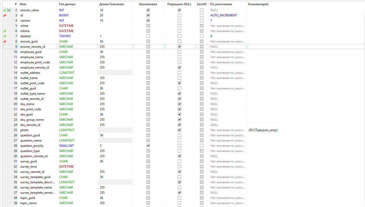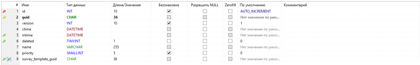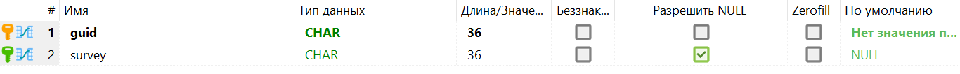 - survey - опросный лист, к которому относится запись, ссылка на таблицу survey