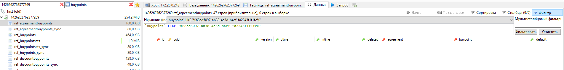 Копируем guid торговой точки и отправляемся смотреть связи Торговых Точек с договорами в таблице ref_agreementbuypoints.