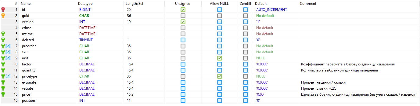 - preorder - заказ, к которому относится запись, ссылка на таблицу doc_preorders